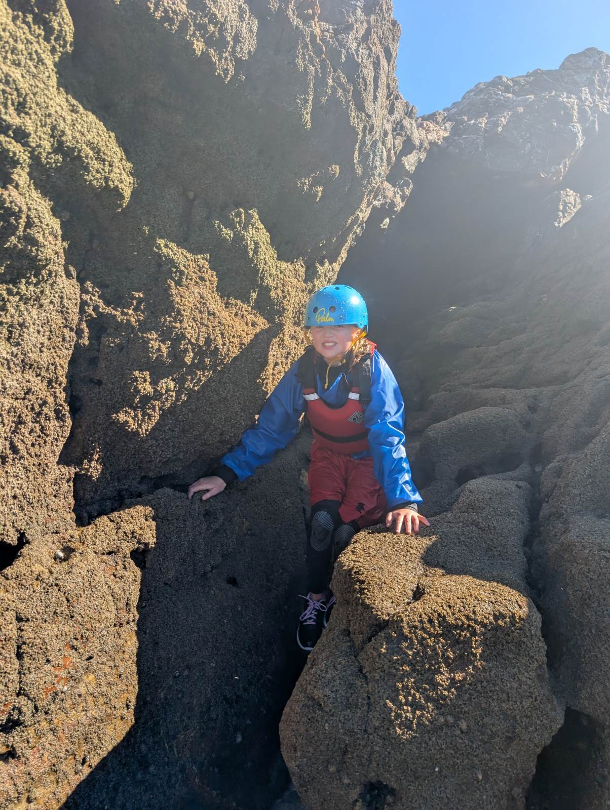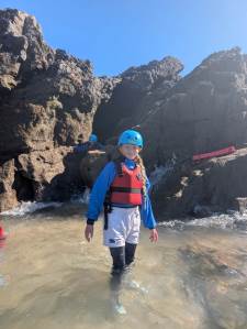 All the children were involved in coasteering this morning, and everyone got involved in jumping into the waves and bobbing around! We then splashed about in a small cove and explored a sea cave. We (and the instructors) were really impressed with the speed at which they were ready and getting through the activity — which meant more time doing the jumps.